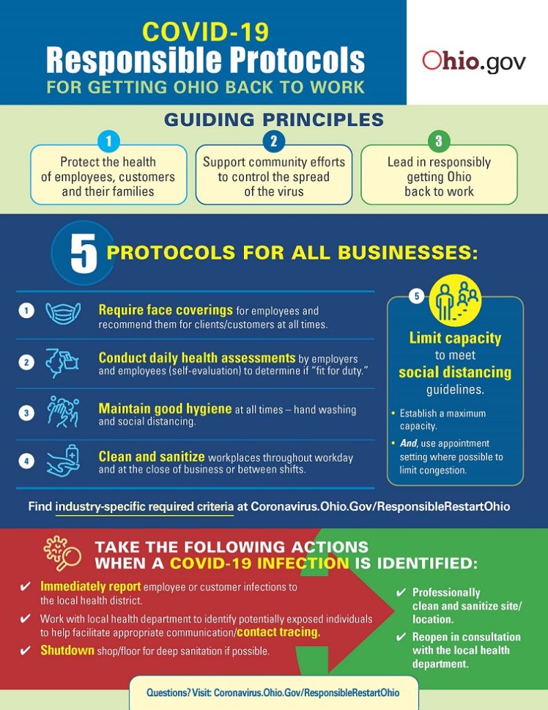 5 Protocols for All Businesses 5 Protocols for all businesses This information was released by the Ohio Department of Health on April 28, 2020. For additional information, please visit the Ohio Covid Portal. Back to COVID-19 resource page