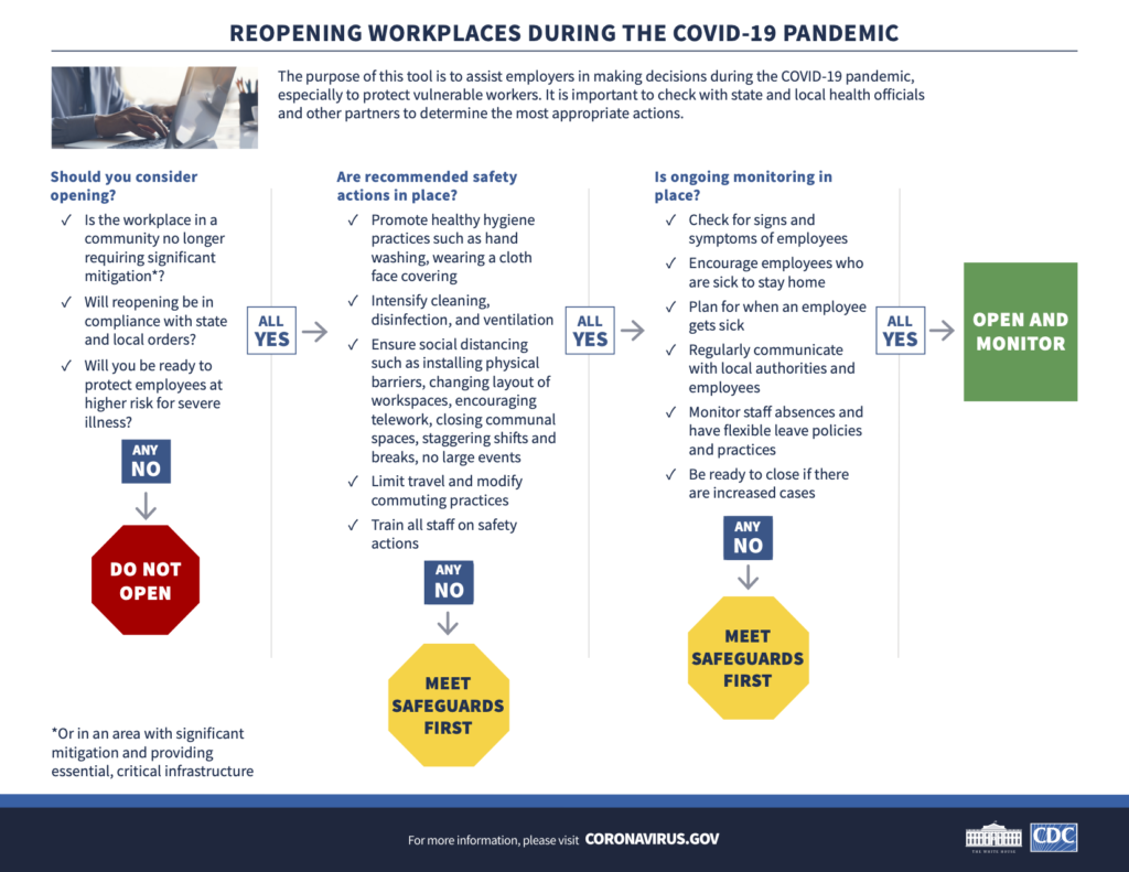 Reopening Workplaces reopening workplaces This information was released by the CDC and last updated October 30, 2020. For additional information, please visit the CDC Covid Portal. Back to COVID-19 resource page