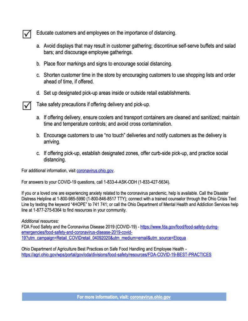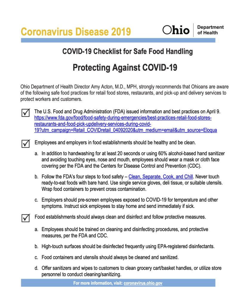 This information was released by the Ohio Department of Health on April 13, 2020. Current evidence shows the biggest risk of transmission of COVID-19 is being around individuals who are symptomatic (and to a lesser extent, infected but not showing symptoms.) For additional information on food and COVID-19, please click here
